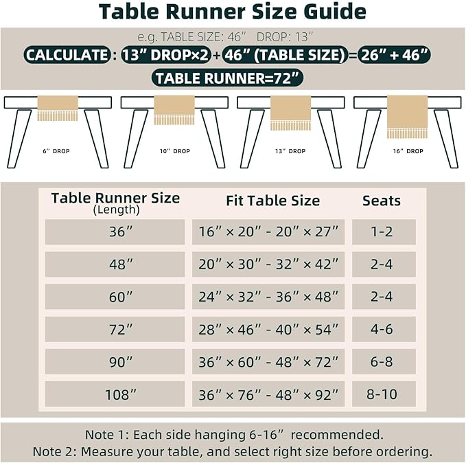 - [Perfect 72 Inches Long] Our macrame table runner with tassels measures 12 x 72inch, fits a dining table that seats 4-8 people. It can give your tables a rustic and boho look. (Because it is folded in the bag, when you take it out, the table runner will have creases, which will affect your measurement. So, please make sure the table runner is placed neatly and flat before measuring)